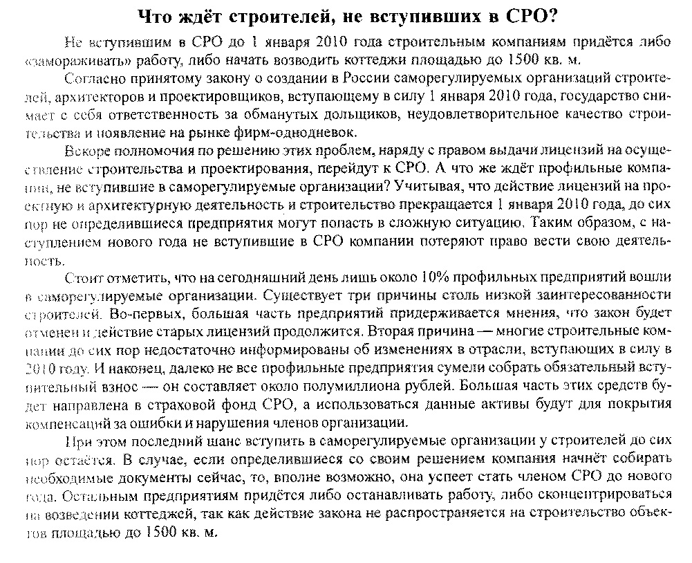 либо начать возводить коттеджи площадью до 1500 кв. м." Из заметки "Что ждет строителей, не вступивших в СРО".